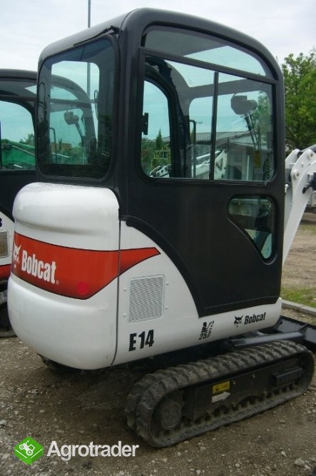 BOBCAT E14 - POEKSPOZYCYJNA - Masa robocza: 1432 kg, Rozsuwane podwozie, Ramię skrętne, przyłącze hydrauliczne na ramieniu, silnik: KUBOTA JAPAN, Moc silnika: 10 kw/2200 rpm 14KM, Gąsienice gumowe, Maksymalna głębokość kopania - 2480 mm, Maksymalny promień kopania 3936 mm; Maksymalna wysokość kopania 3398 mm, Maksymalna Siła kopiąca ramienia 8,5 kN; Maksymalna Siła kopiąca łyżki 13,1 kN; Szerokość lemiesza 980/1363 mm, Wysokość lemiesza 210 mm, Wymiary podwozia bez lemiesza dł. x sz. x wys.(mm): 1354 x 980/1363 x 2151; OSPRZĘT: łyżka kopiąca; linia hydrauliczna na ramieniu kopiącym; OPCJE: szybkozłącze mechaniczne do wymiany łyżek, młot hydrauliczny, wiertnica, łyżki