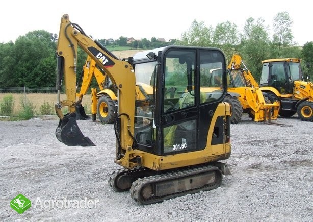 Koparka gąsienicowa CAT 301.6 C z ogrzewaną kabiną zamkniętą. Waga: 1,75 tony, gąsienice gumowe, lemiesz spycharkowy, funkcja - lemiesz pływający, instalacja hydrauliczna, dwie prędkości jazdy, nowa łyżka koparkowa szer. 30cm.