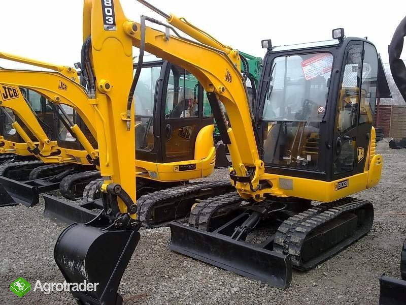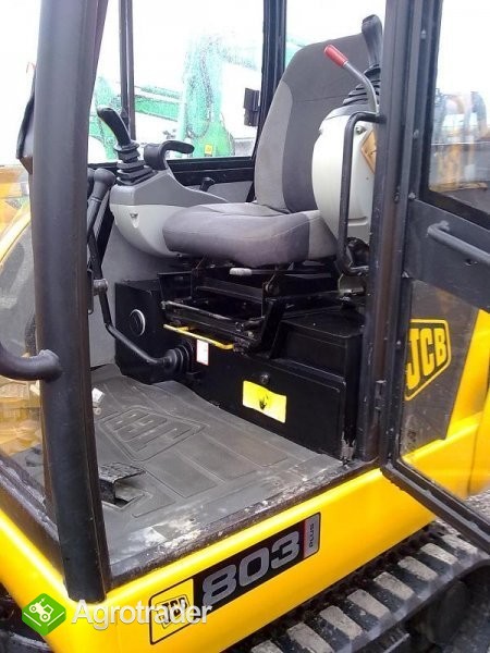 Mini koparka gąsienicowa JCB 803 Plus z silnikiem Perkinsa o mocy 30 kM. Rok produkcji: 2005. Masa maszyny 2975kg. Zamknięta, przeszklona i ogrzewana !!! kabina, lemiesz hydraulicznie sterowany. Dwa biegi jazdy. Linia do osprzętu dodatkowego np. młota lub wiertnicy lub nożyc. Trzy łyżki. Stan maszyny idealny. Maszyna gotowa do pracy. Mocna maszyna. Przebieg to jedynie 2625 MTG.