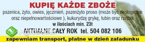 Kupię zboża paszowe, konsumpcyjne, ekologiczne i gorzelniane. Ponadto kupuje groch, bobik,kukurydzę, łubin, rzepak, odpady zbożowe wymagane ilości min 23t. Płacimy w dniu odbioru , zapewniamy transport KONKURENCYJNE CENY zapraszamy osoby prywatne oraz firmy - tel.504082106