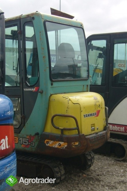 YANMAR B15-3 - Masa robocza: 1629 kg, Ramię skrętne, silnik: YANMAR JAPAN, Moc silnika: 11,2 kw/2600 rpm 15,2KM, Gąsienice gumowe, Maksymalna Siła kopiąca ramienia 753 kg; Maksymalna Siła kopiąca łyżki 1211 kg; Szerokość lemiesza 1000 mm, Wysokość lemiesza 235 mm, Wymiary podwozia bez lemiesza dł. x sz. x wys.(mm): 1473 x 1000 x 2270; OSPRZĘT: łyżka kopiąca; linia hydrauliczna na ramieniu kopiącym; OPCJE: szybkozłącze mechaniczne do wymiany łyżek, młot hydrauliczny, wiertnica, łyżki